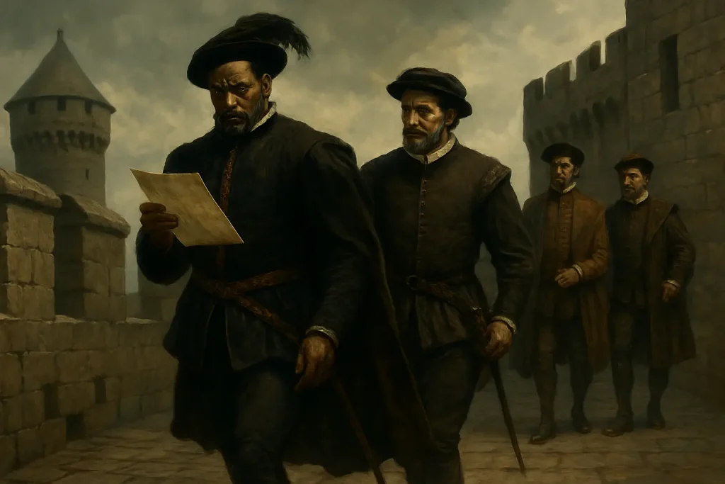 चित्र विवरण: एक यूरोपीय किले की दीवारों पर ओथेलो, आईगो और कुछ सज्जनगण चलते हुए, ओथेलो के हाथ में पत्र, सभी एलिज़ाबेथन पोशाक में।